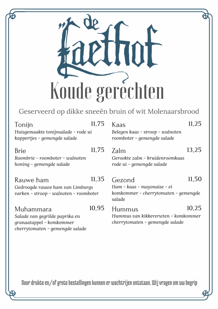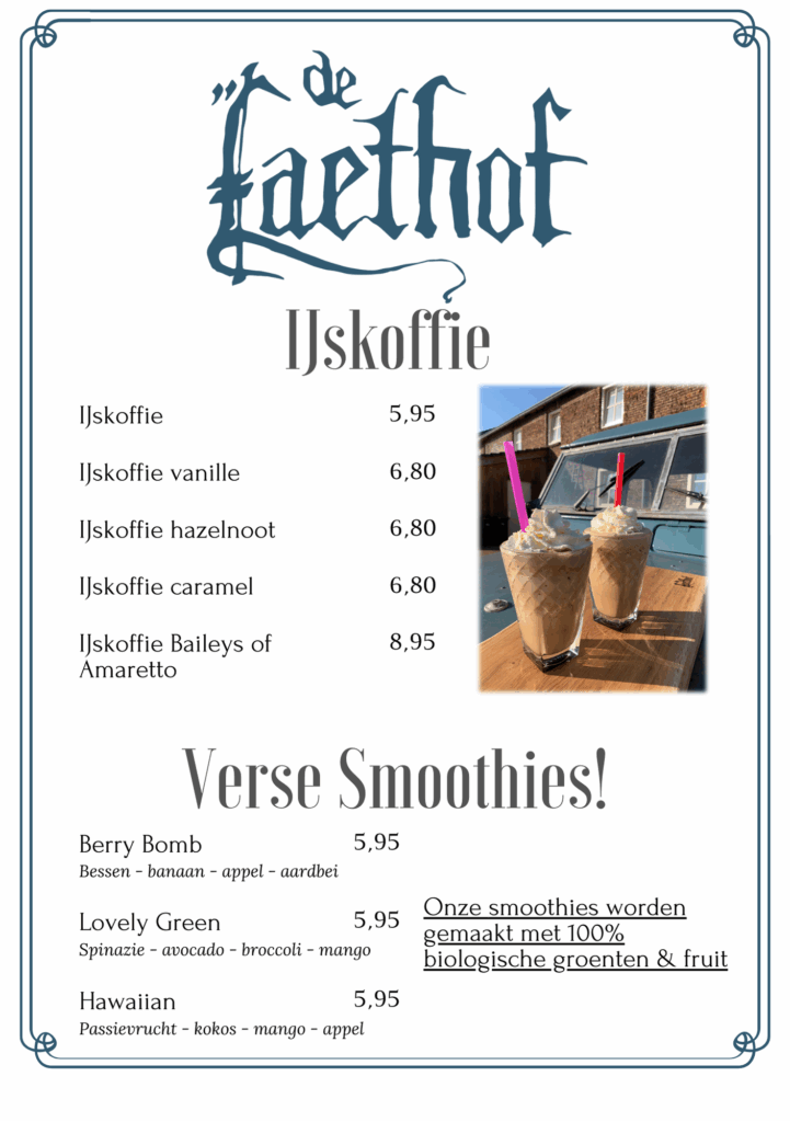 O.a. onze luxe borrelplanken met lokale producten (warme en koude lekkernijen), een verse kop cappuccino, een dampende thee, een warme chocolademelk met échte slagroom, dagverse vlaai van de lokale bakker, een verse 100% biologische smoothie, een zalige kop vers gemaakte soep, een knapperig warme of koude lunch met brood, lokale (uit Mesch!) en buitenlandse wijnen & bieren, tosti’s, loaded nacho’s, vers bereide lemonades, ijskoffie’s en meer.