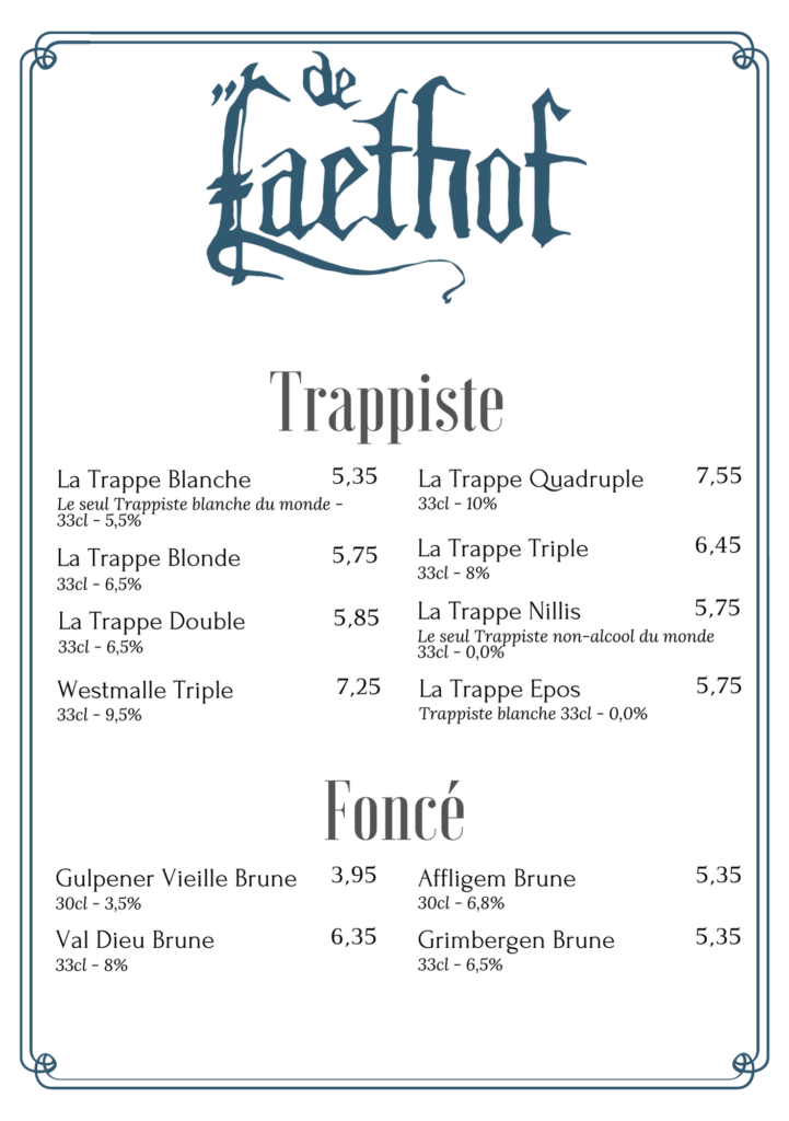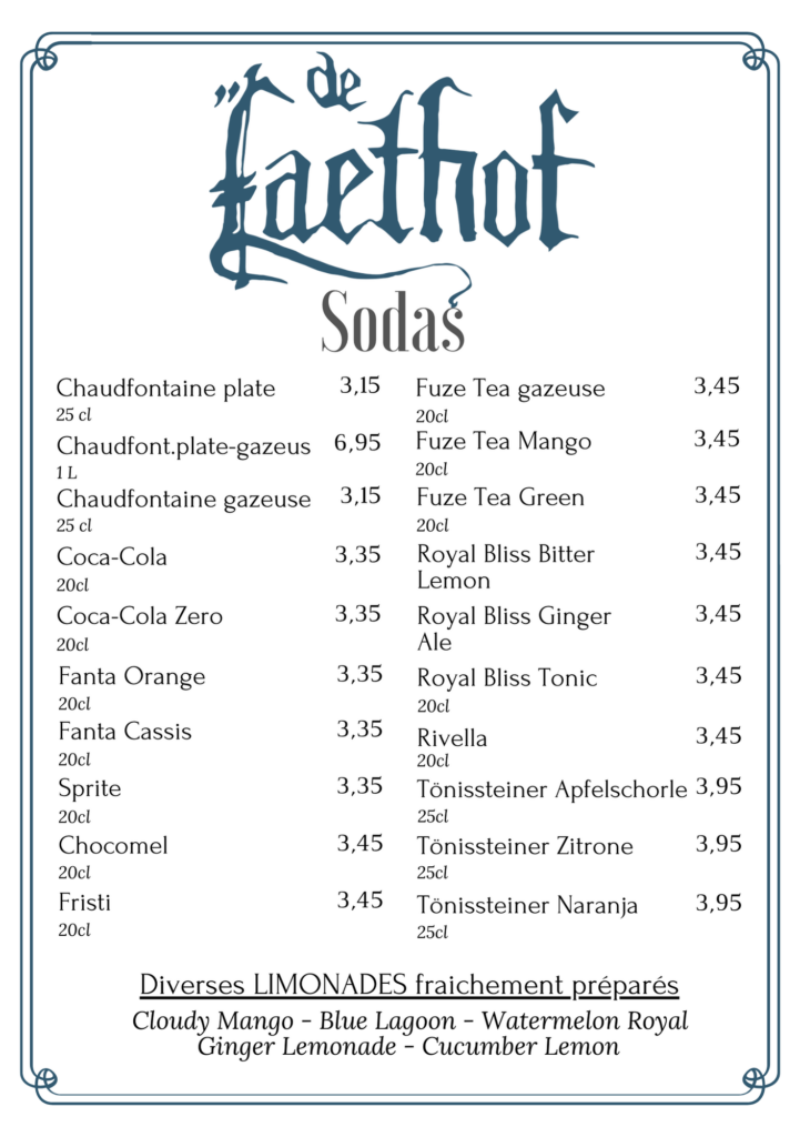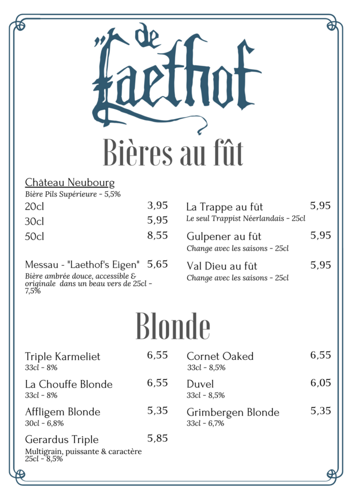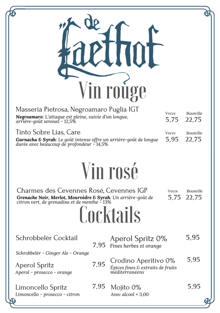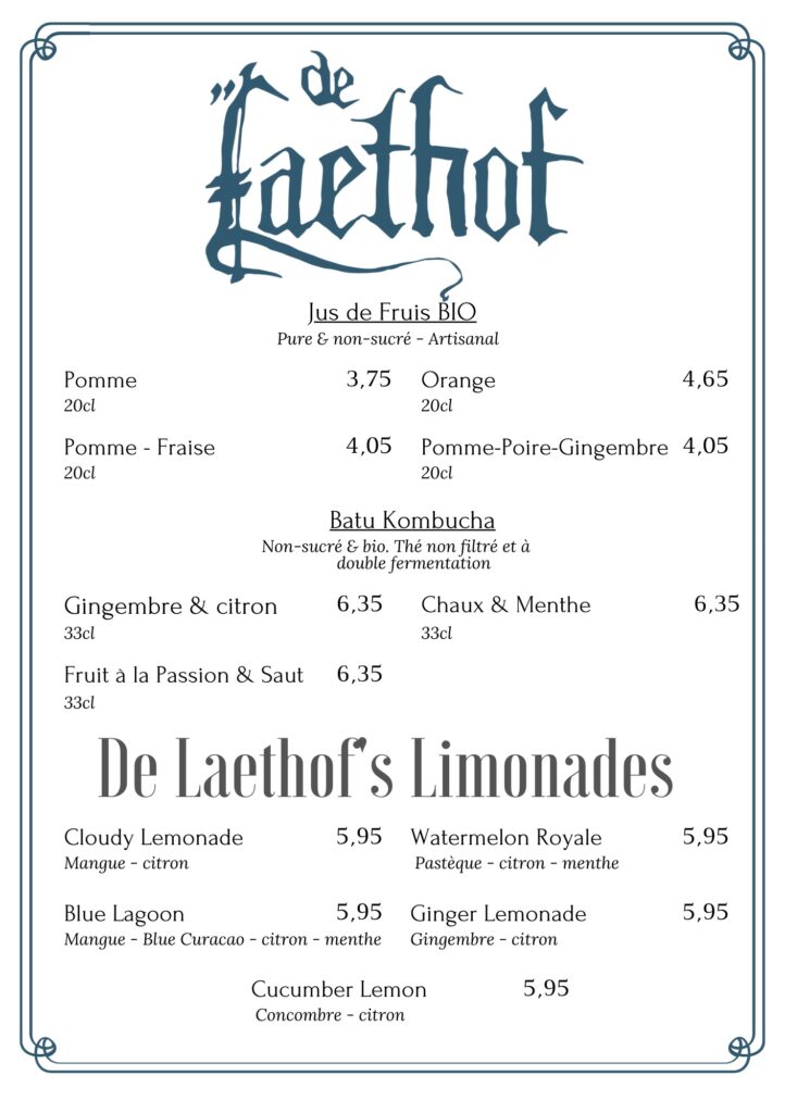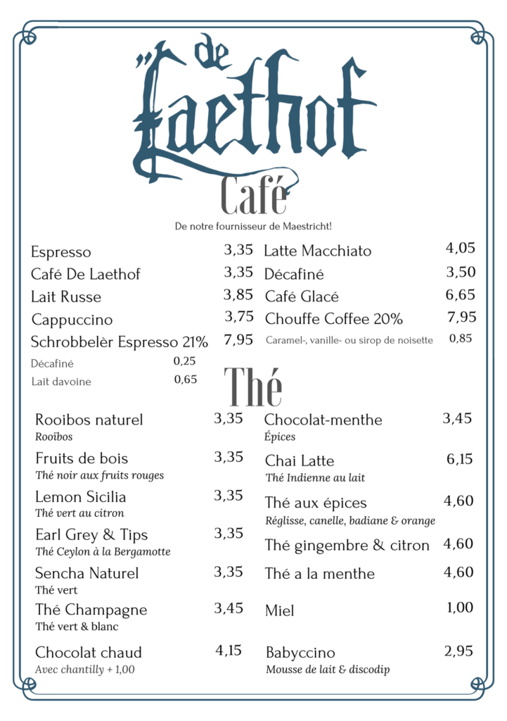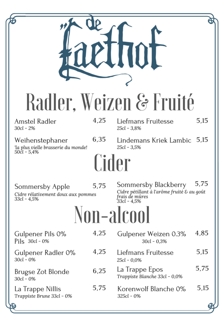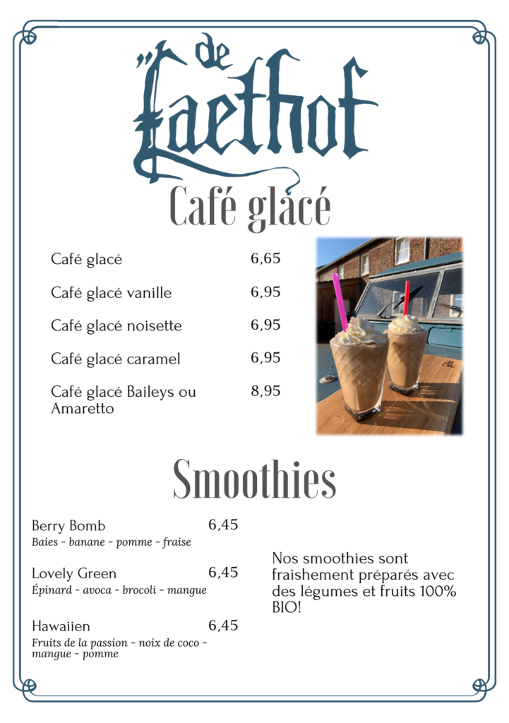 Bienvenue à “De Laethof”, avec sa terrasse charmante, sa ferme cosy et sa véranda ensoleillée. Garez-vous sur notre parking privé, et venez découvrir notre petit coin de bonheur! Laissez-nous vous chouchouter avec nos bières Belges et locales, vins locaux, des coupes crème-glaces, des potages et soupes faites maison, les salades, du café et cappuccino avec des tartes et bien plus encore…