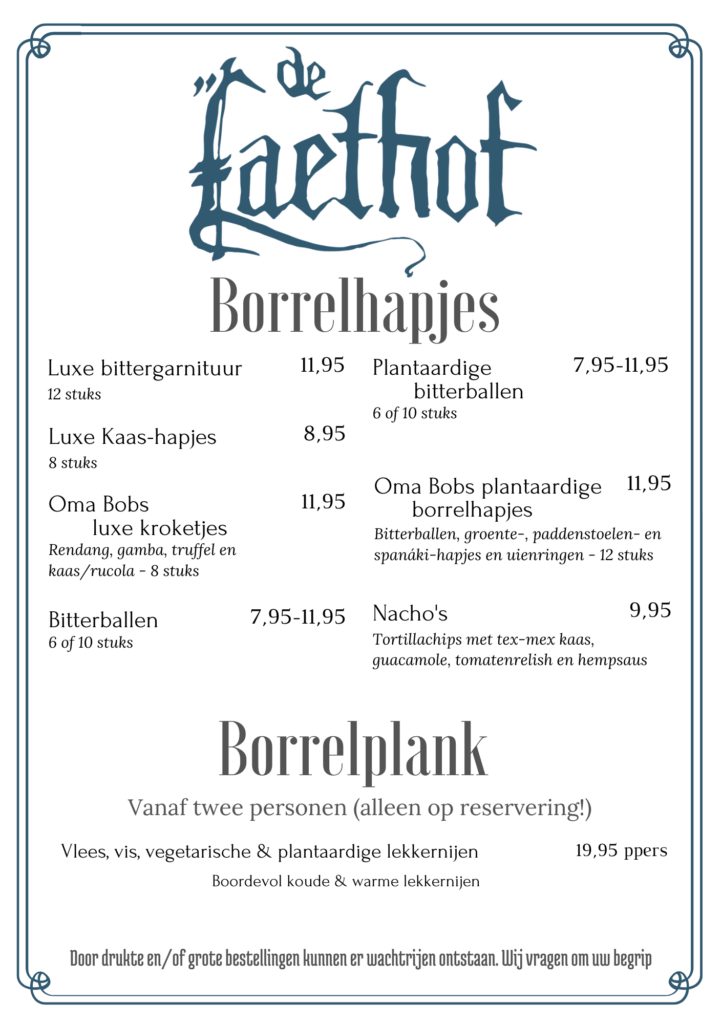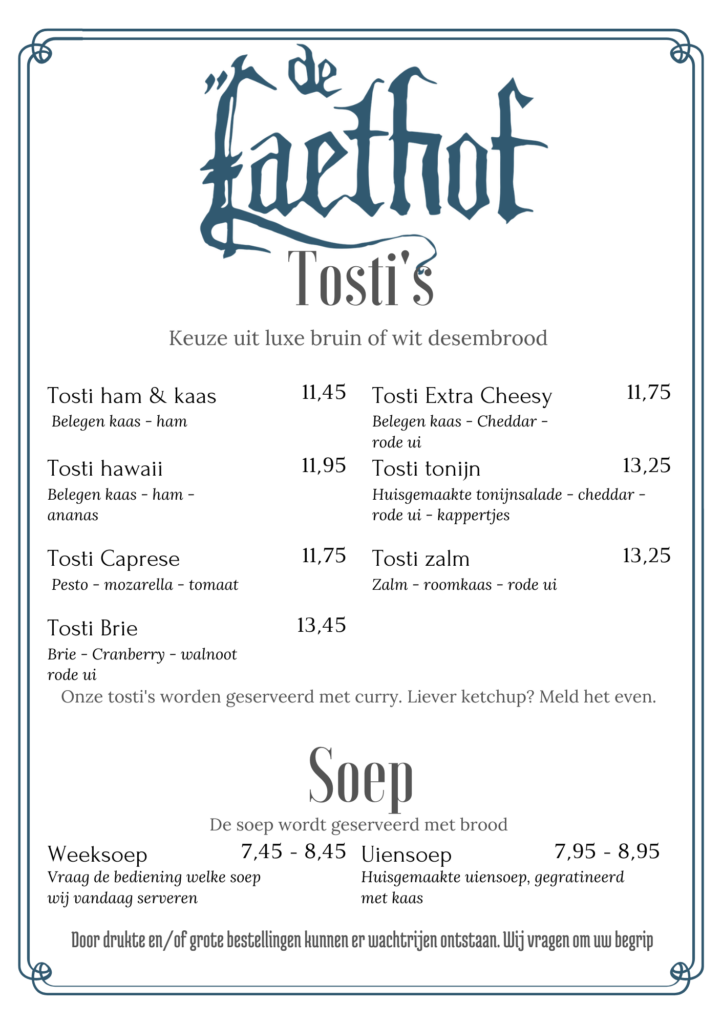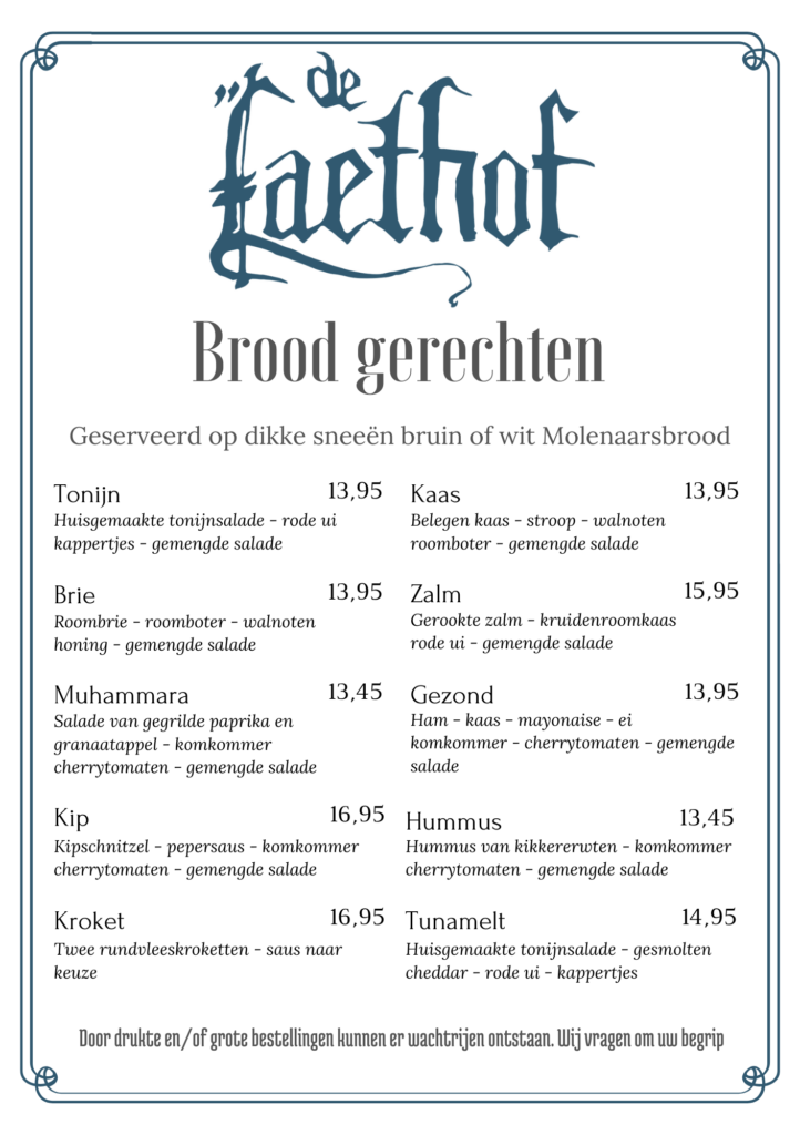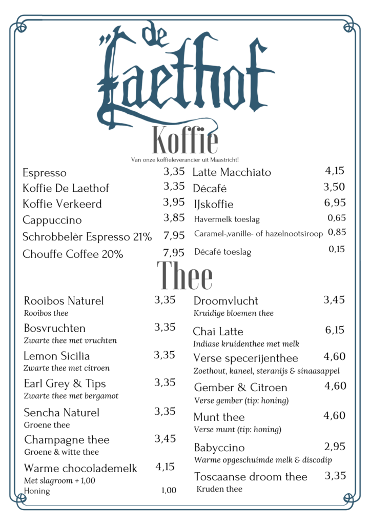 O.a. onze luxe borrelplanken met lokale producten (warme en koude lekkernijen), een verse kop cappuccino, een dampende thee, een warme chocolademelk met échte slagroom, dagverse vlaai van de lokale bakker, een verse 100% biologische smoothie, een zalige kop vers gemaakte soep, een knapperig warme of koude lunch met brood, lokale (uit Mesch!) en buitenlandse wijnen & bieren, tosti’s, loaded nacho’s, vers bereide lemonades, ijskoffie’s en meer.