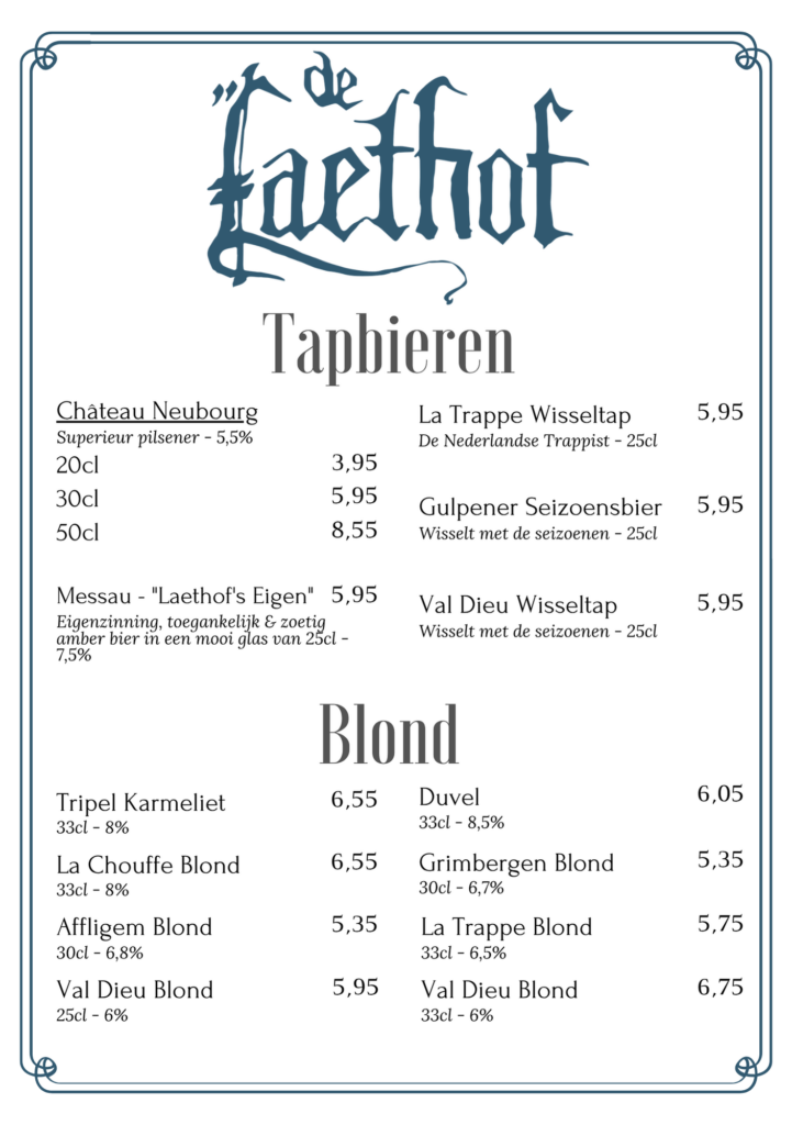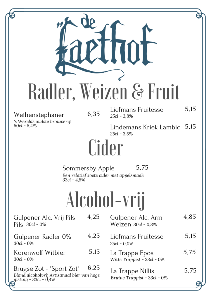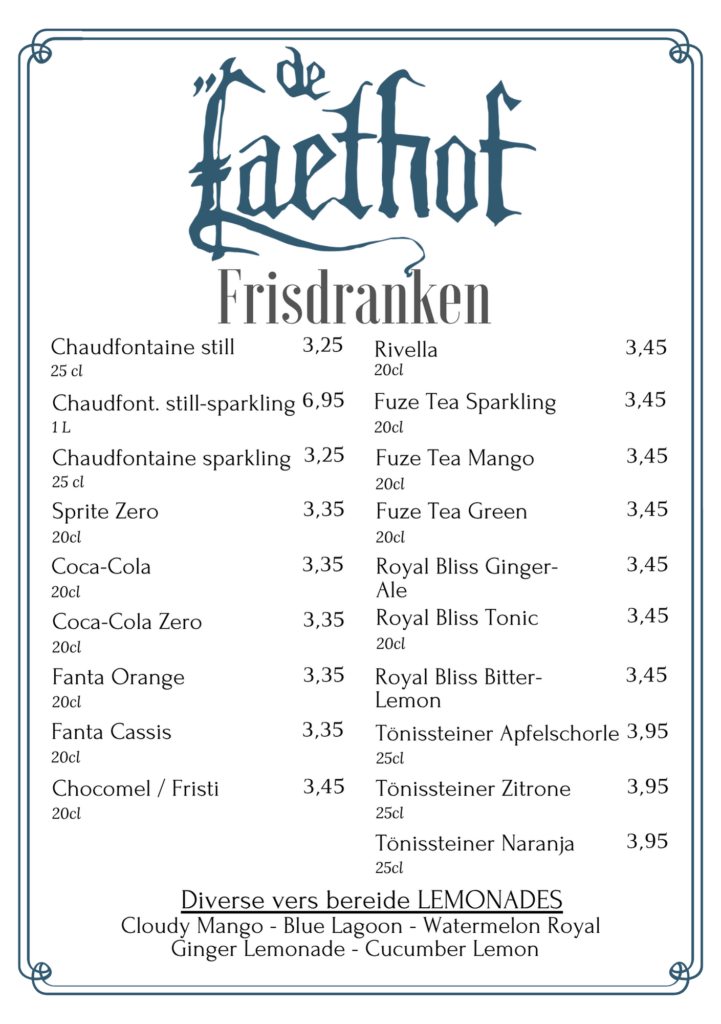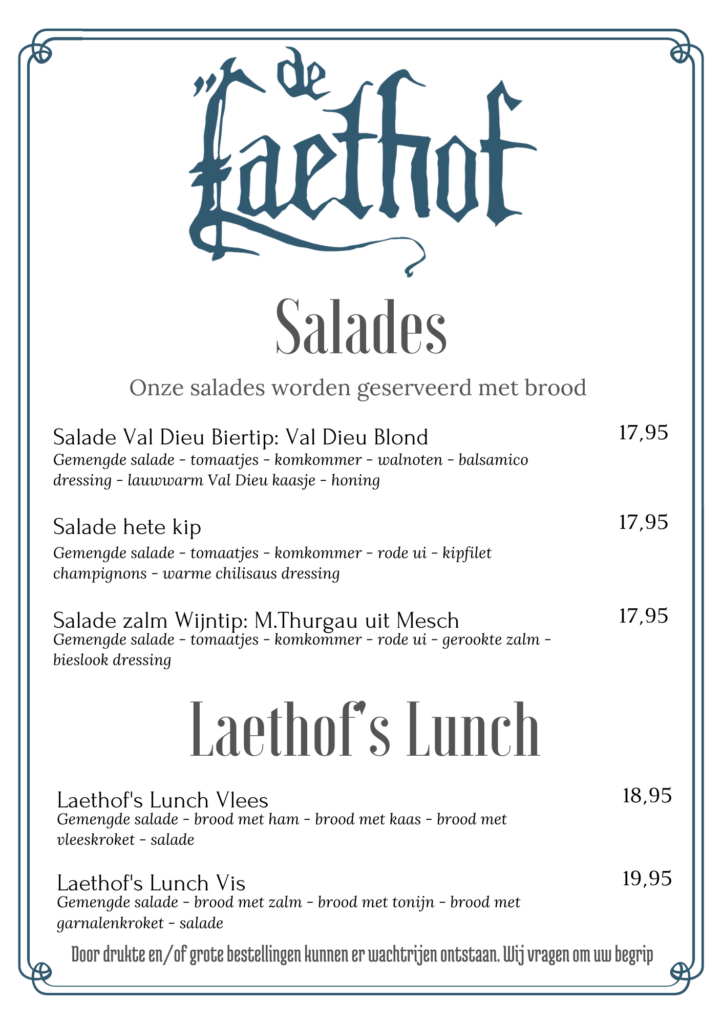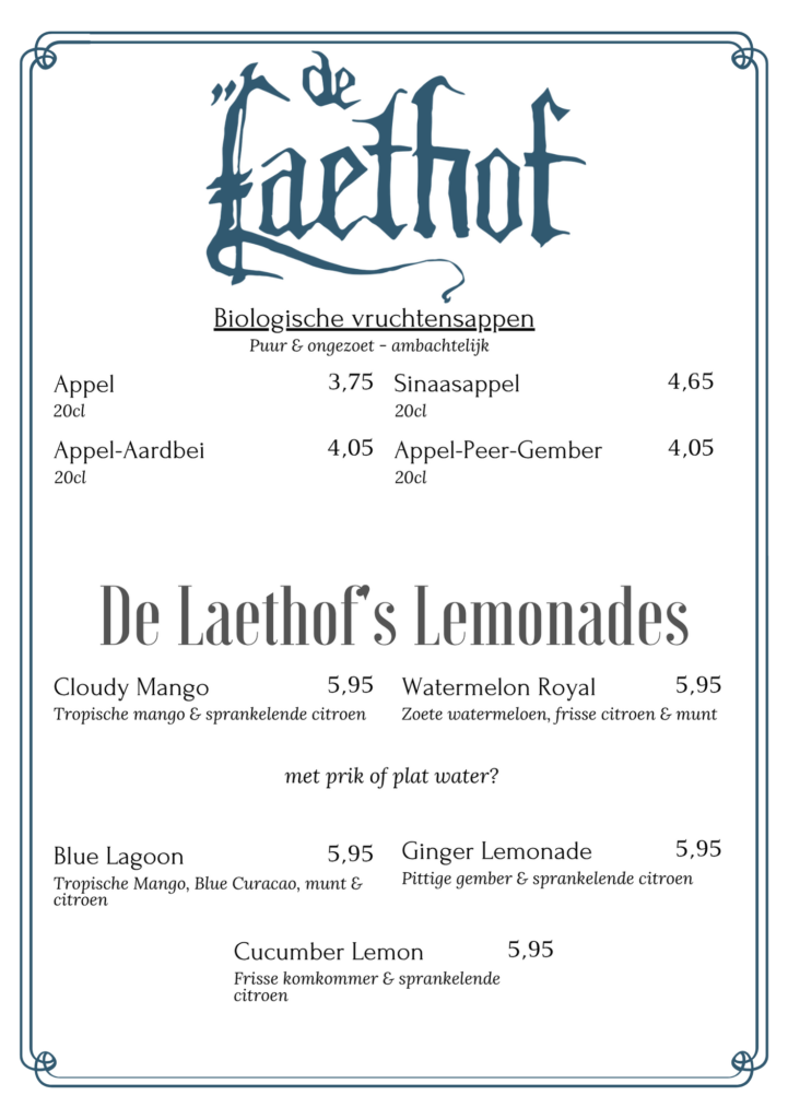 O.a. onze luxe borrelplanken met lokale producten (warme en koude lekkernijen), een verse kop cappuccino, een dampende thee, een warme chocolademelk met échte slagroom, dagverse vlaai van de lokale bakker, een verse 100% biologische smoothie, een zalige kop vers gemaakte soep, een knapperig warme of koude lunch met brood, lokale (uit Mesch!) en buitenlandse wijnen & bieren, tosti’s, loaded nacho’s, vers bereide lemonades, ijskoffie’s en meer.